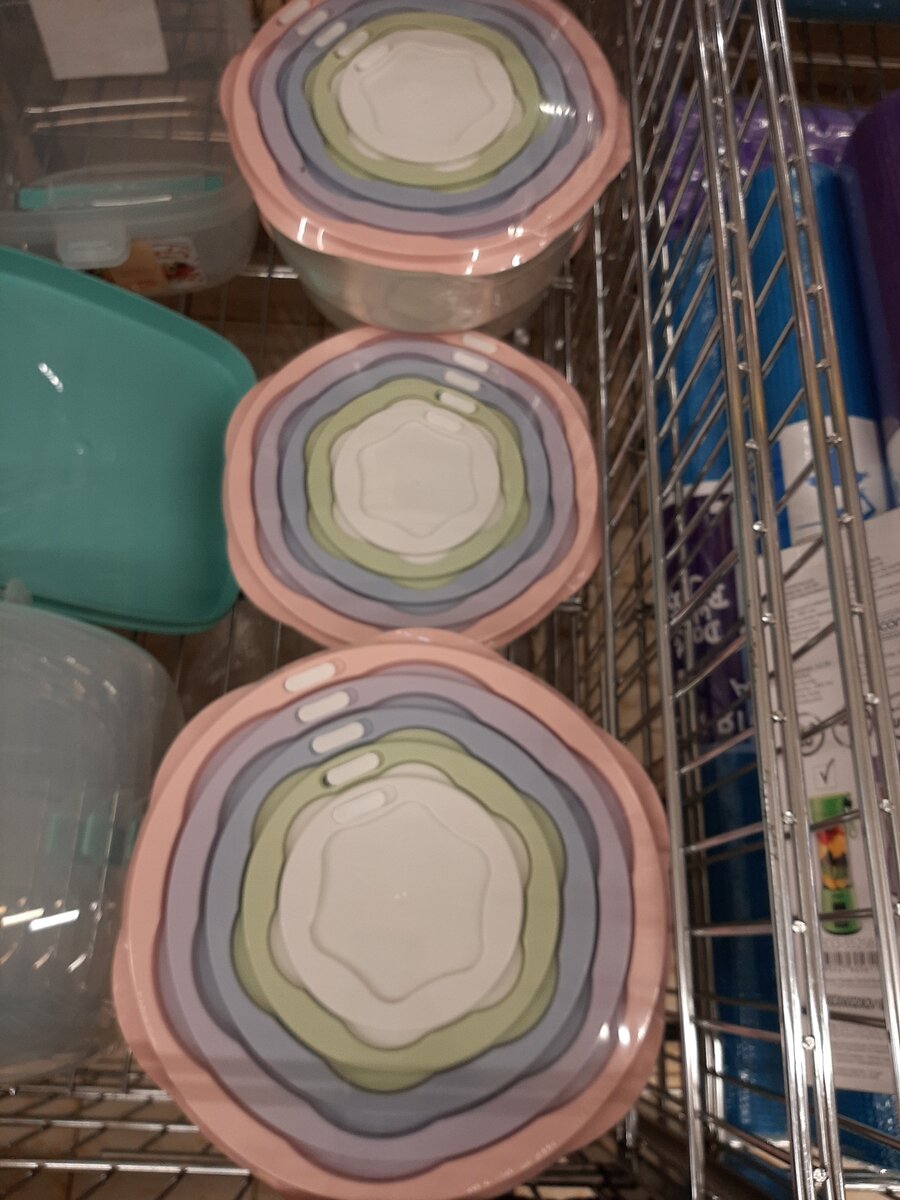 Набор состоит из пяти чашек с крышками разного объема от 0,3 до 4,1 литра. Такой набор всегда пригодится в хозяйстве.