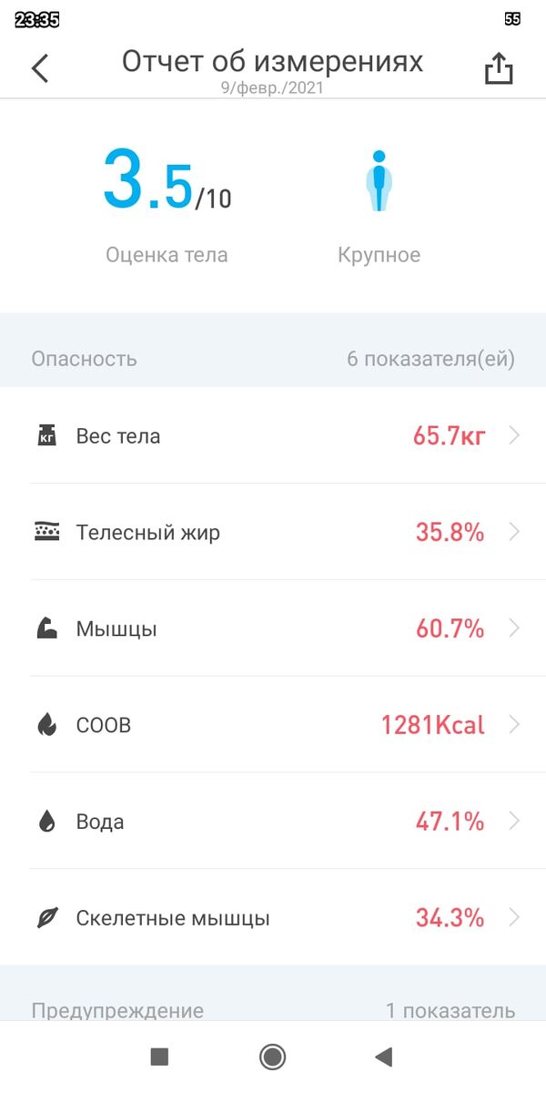 Вес увеличился, и я надеюсь, что в основном это из-за месячных, потому что весы показывают, что жира меньше - 35.8 %, а воды, наоборот, больше. Понятно станет где-то через пару дней, что на самом деле с моим весом.