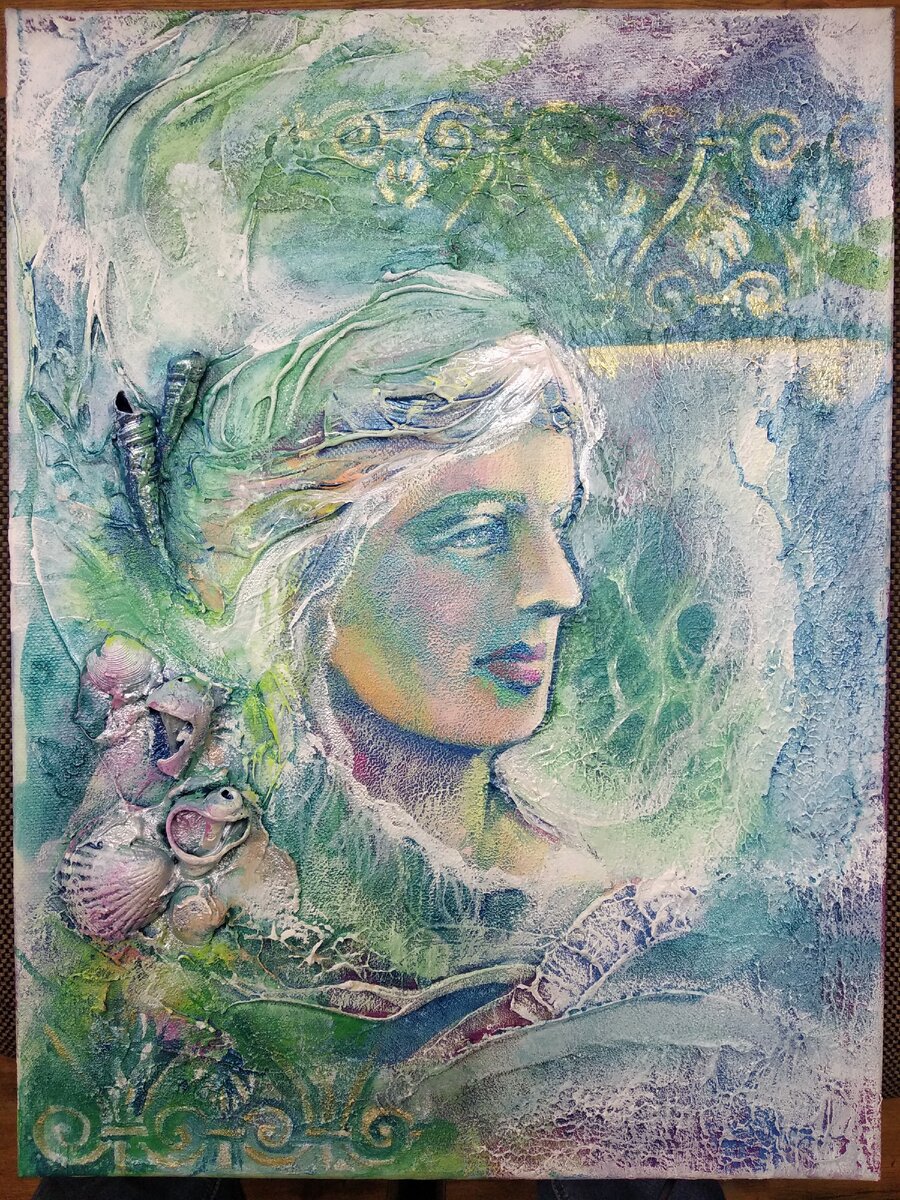 При продумывании образа я решила обойтись без атрибутов богини- золотого пояса, яблока, гребня и зеркала, и запечатлеть момент её возникновения из морской пены.