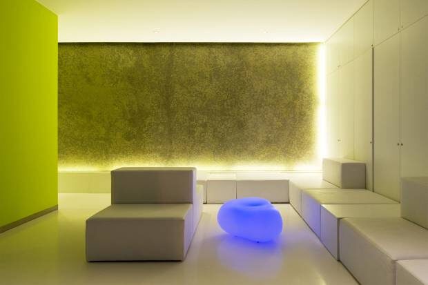 - Неоновое освещение интерьера дополняет подсветка мебели.