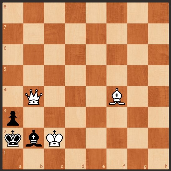 Очередная шахматная задача. Автор задачи Матфей, Ганс Георг. Черный король находиться в углу шахматной доски. Черные слон защищен черной пешкой. Черные могут ходить королем на а1. Однако белые начинают и ставят мат всего в два хода.