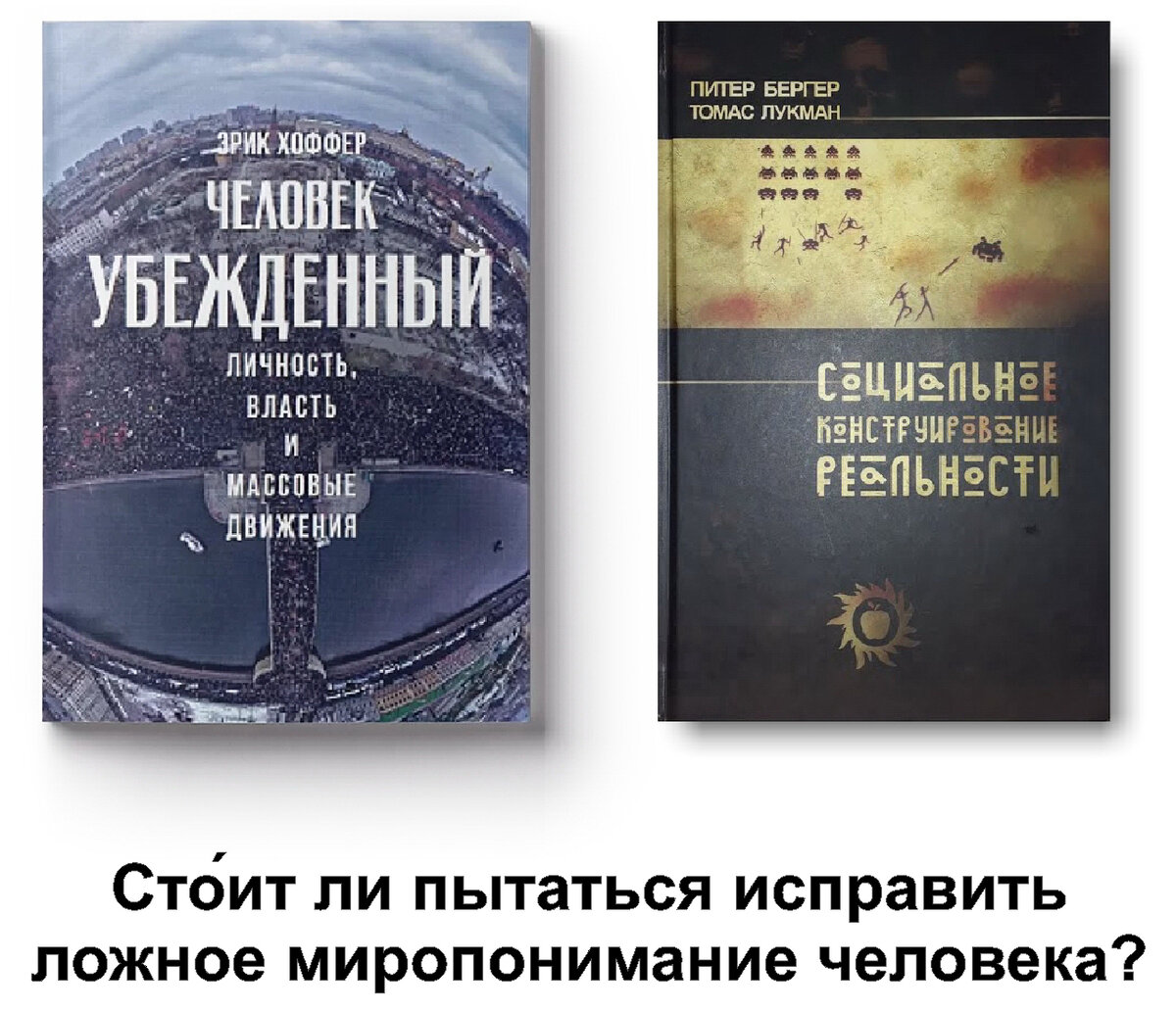 Подробнее об этом рекомендую почитать книги: Эрик Хоффер «Истинноверующий. Мысли о природе массовых движений» и Питер Бергер & Томас Лукман «Социальное конструирование реальности».