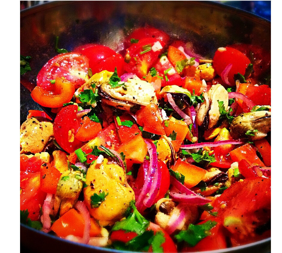 4. Из мидий сливаем масло и добавляем в наш салат.
