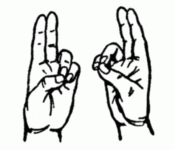 Выполнение: соединить подушечки безымянного и среднего пальца. Мизинец и указательный палец выпрямлены.