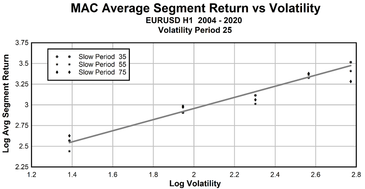Средняя доходность сегмента и средняя длина сегмента сильно различаются в зависимости от волатильности модели пересечения скользящих средних (MAC). Обе эти характеристики паттерна подчиняются степенному закону.