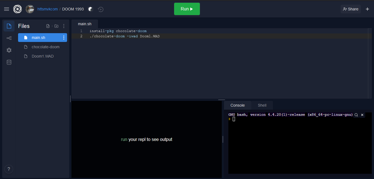 Заходим на сайт https://repl.it/@httsmvkcom/DOOM-1993, после чего нажимаем на "Run", чтобы запустить процесс установки игры.