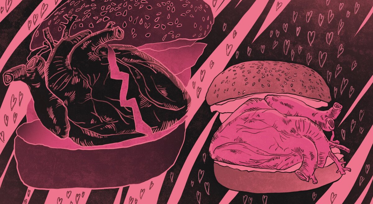Чёрный бургер будет с двумя говяжьими котлетами, сыром, специальным соусом и луком. Розовый бургер — с котлетой из лосося в панировке, с сыром и соусом. Оба бургера сверху украшены кунжутом.