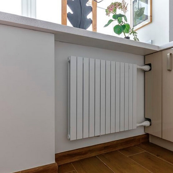 - Настенный радиатор с нижним подключением G½" (правым или левым), в комплектации с необходимыми заглушками, воздухоотводчиком и с встроенным термоклапаном (для двухтрубных систем отопления).
