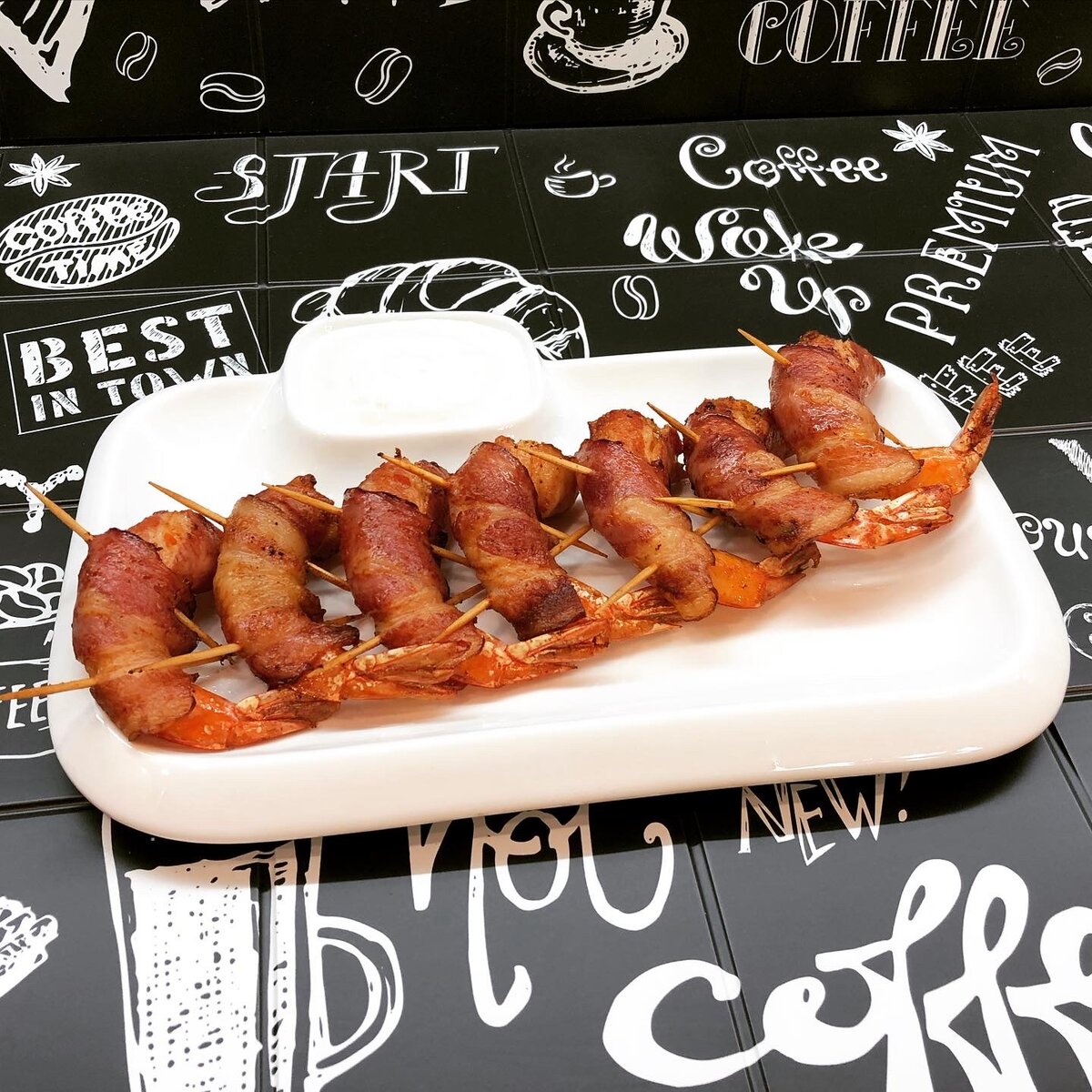 Заворачиваем каждую креветку в бекон, закрепляя зубочистками.