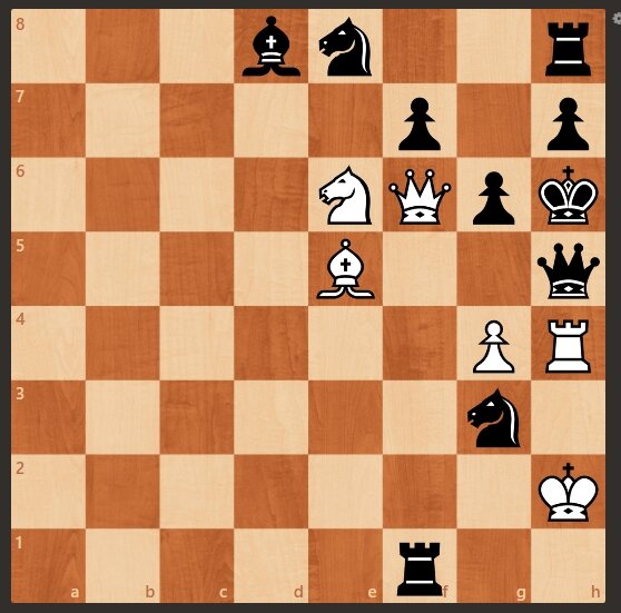 Очередная шахматная задача. У черных материальный перевес в виде: двух лишних пешек, лишнего коня и лишней ладьи. Однако ход белых и они ставят мат в один ход. Не каждый шахматист быстро найдет мат в один ход.