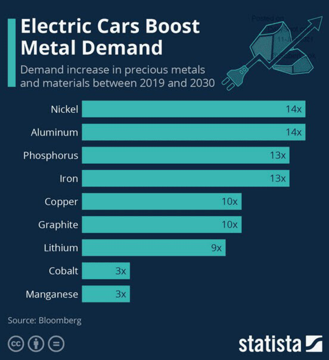 К счастью, нам нет нужды гадать. Что в наши дни может стать аналогом лопат в 19 веке? Забавно, но это ископаемые металлы. Только не золото, а литий, никель, медь, кобальт и некоторые другие цветные металлы необходимые электрокарам.