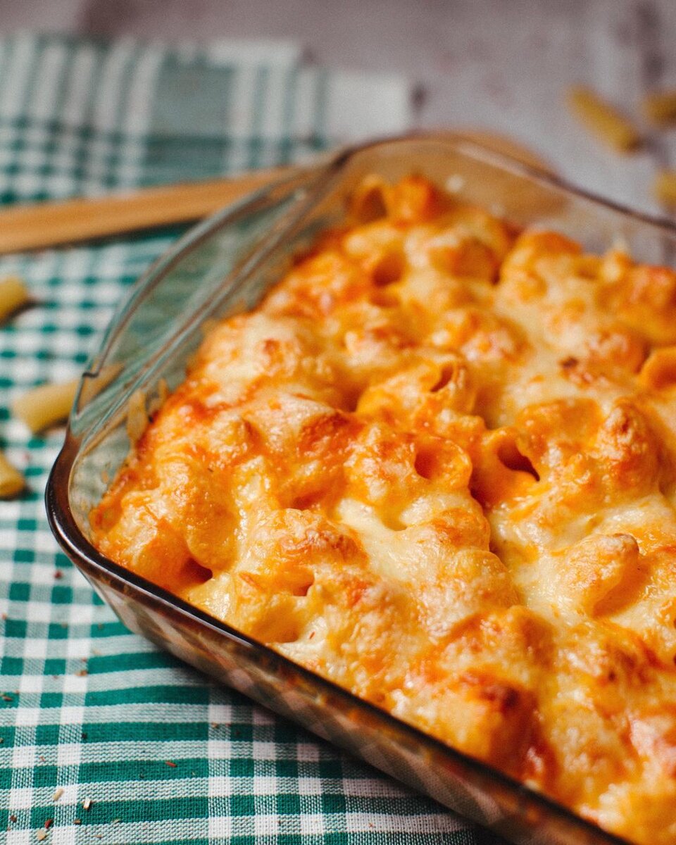 К таким макаронам идеально подойдет жареный бекон или кусочки копченой курицы.