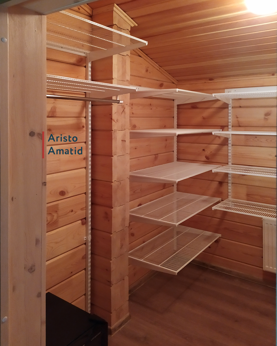 Нет особой разницы, из чего дом: из клееного бруса, газобетона, кирпича или каркасника. Отделан ли он вагонкой, гипроком, штукатуркой, оставлен бревенчатым / брусом или нет. Стандартная особенность одна: для расположения элементов гардеробной в мансарде, каждую следующую направляющую нужно крепить на уровень ниже. Соответственно, под каждую – размещать тщательно высчитанный несущий рельс, чтобы ровно попадало на венец.