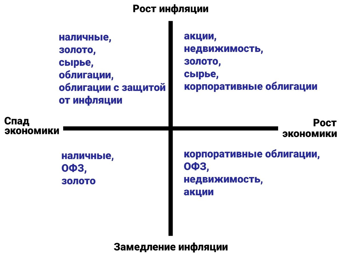 Существует четыре фактора(экономических времен года), которые влияют на цену активов: