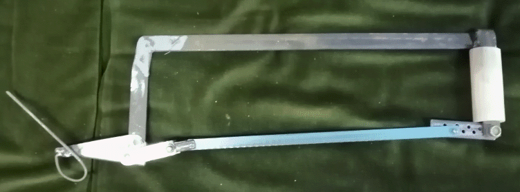 Все видели, как закрывается молочная фляга. На таком же принципе сделана самодельная ножовка. Рамка ножовки изготовлена из стальной полоски с помощью сварки. Планка с отверстиями закреплена на одной стороне шарнирно. Она служит для предварительной натяжки полотна.
