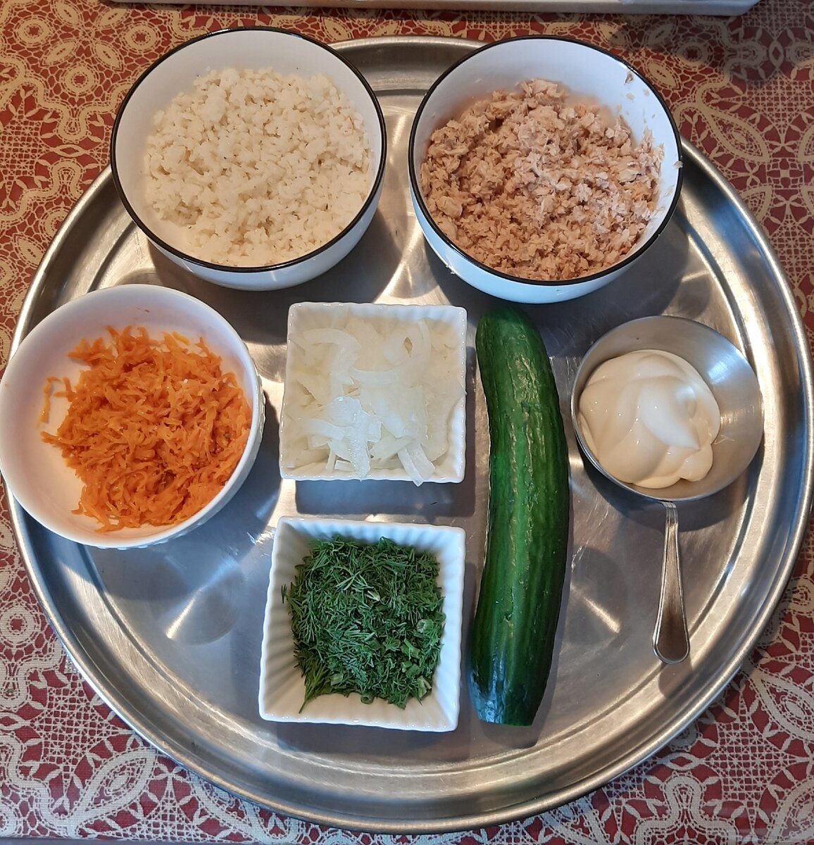 Рис--майонез--рыба--майонез--лук--морковь--майонез-огурцы+укроп