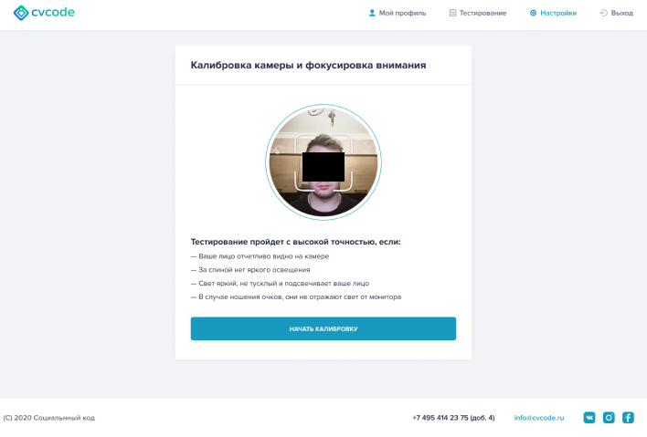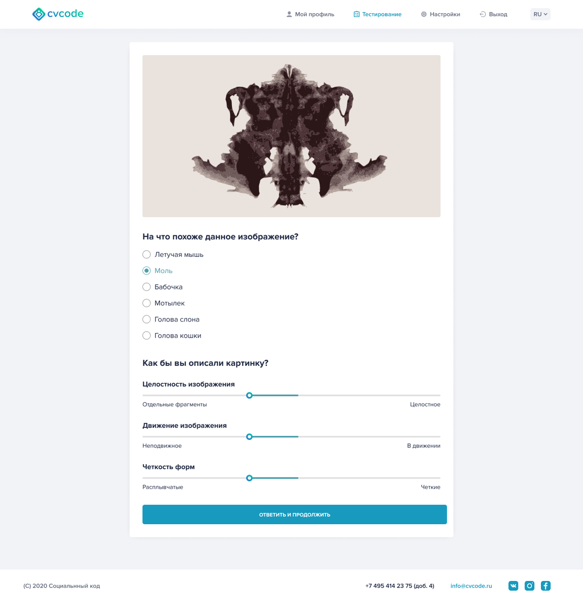Для примера, команда Социального кода взяла тест Роршаха (в этом тесте используются 10 клякс). Процесс диагностики построен следующим образом. Сначала система калибрует движение глаз (eye-tracking) и определяет положение головы анализируемого в пространстве. Далее предлагается ответить на 10 тестовых вопросов. В каждом вопросе демонстрируется изображение кляксы на 3 секунды и предлагается выбрать название образа, максимально описывающего увиденное. Кроме того, в задании оценивается целостное восприятие, восприятие динамики изображения и сохраняются данные по времени, затраченном на ответ. Помимо отслеживания движения глаз, на сайте CVCODE отслеживается движение курсора и нажатие клавиш на клавиатуре. Такая совокупность данных частично повторяет регламент оценки поведения человека, который используют студенты психологического факультета на первом курсе обучения.