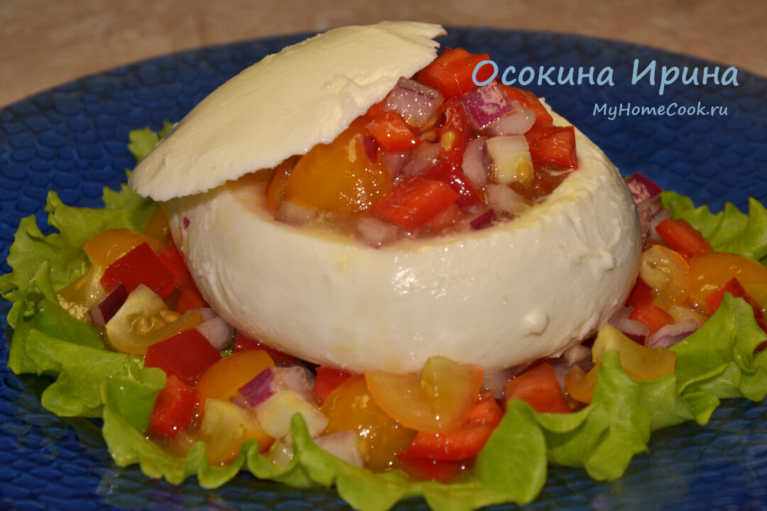 На 1 шарик (125 г) моцареллы: порезала квадратиками 1/2 красного сладкого перца, добавила 5 резанных жёлтых помидорок черри и 1/2 красной луковицы кубиком и промешала, залила подвзбитой до состояния эмульсии смесью 1 ст.л. оливкового масла, 1 дес.л. яблочного уксуса и 1 ч.л. жидкого мёда, присолила, промешала и оставила подмариноваться на час. У шарика моцареллы тонко срезала верхушку,