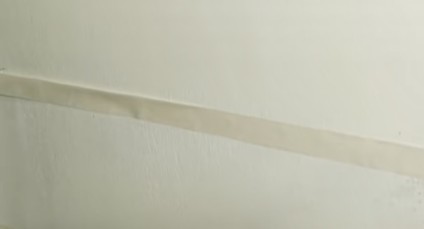 Сначала наклеиваем горизонтальной полосы, ни в коем случае не вертикальные. Стена должна быть основательно прогрунтована, иначе скотч липнуть не будет.