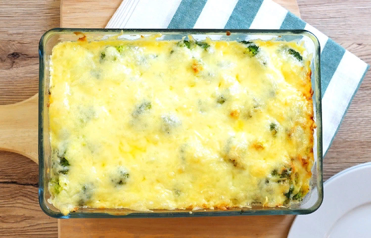 Запеканка с рисом, овощами и курицей. Все полито сметаной и посыпанный желтым сыром.