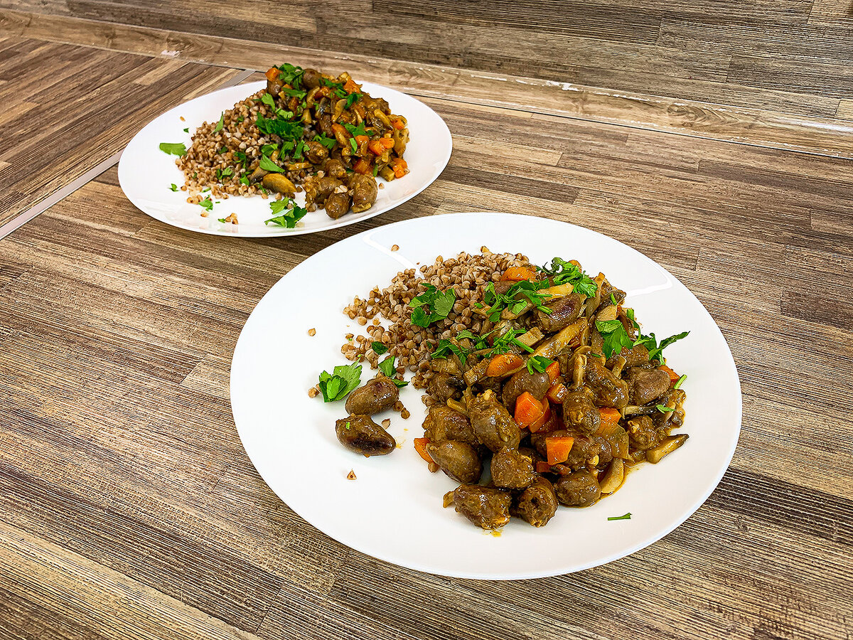 Лук нарезать четвертинками и обжарить до золотистости. Промытые сердечки отправить к луку целиком и нарезанную четвертинками морковь. Немного обжарить. Добавить нарезанные грибы, томатную пасту, специи и соль. Перемешать. Накрыть крышкой и тушить 40 минут. Подавать с любым гарниром.