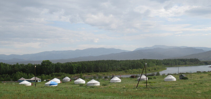 4. В юрте, конечно, уютненько, но все удобства в поле. Маленькая желтенькая постройка справа- это туалет. Ночью идти туда совсем нет энтузиазма..... На горизонте виден Бий-Хем, т.е. Большой Енисей. Купаться стало нерекомендательно, т.к. выше по течению китайцам отдали в аренду промышленное предприятие по добыче чего-то. Теперь река то мыльная, то мутная, то вонючая.