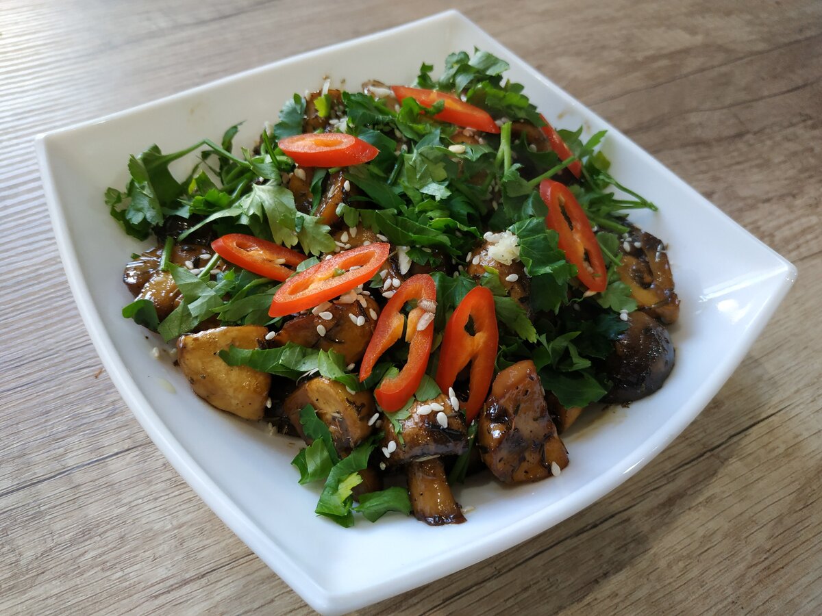 Готовые грибы перекладываем в тарелку и по желанию посыпаем перцем чили, петрушкой и кунжутом.