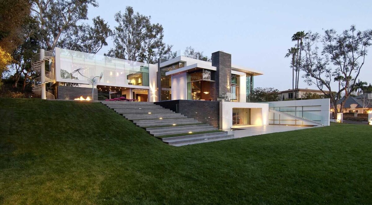 Этот эффектный современный особняк расположен в районе Беверли-Хиллз, штат Калифорния, США. Дом стоит на возвышении холма, представляя собой серию вертикальных и горизонтальных плавающих плоскостей. К дому ведут 2 лестницы, расположенные по двум сторонам фасада, которые просто лежат на поверхности склона холма и вмонтированы в естественный рельеф участка.