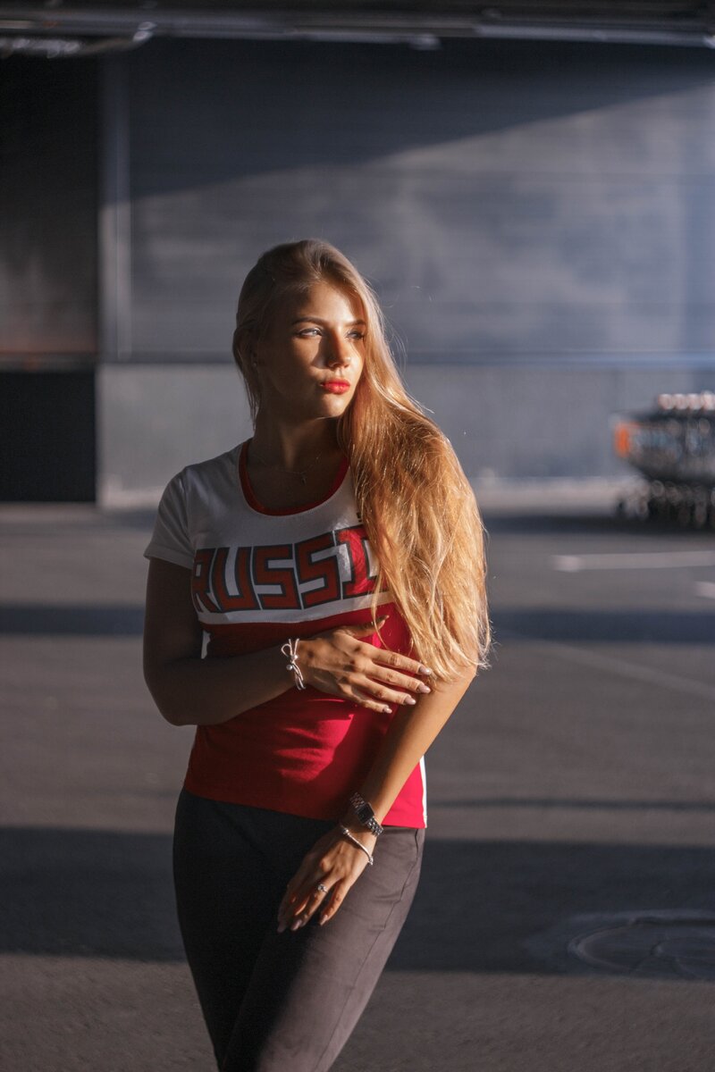В кадре нравилось буквально всё. Во-первых, это образ модели, казалось бы, достаточно обычная одежда, но она очень хорошо влилась в антураж парковки. Во-вторых, я снимал это на советский объектив Гелиос 58 мм, который дал очень интересное размытие заднего плана (то есть самой парковки). И все эти колонны, ряды ламп и припаркованные автомобили, на мой взгляд, создают неплохой антураж для фотографии. В следующем кадре я уже отошел подальше от модели и сделал вертикальный кадр, захватив побольше потолка с лампами. Получилась хоть и похожая на предыдущую, но всё таки другая фотография.