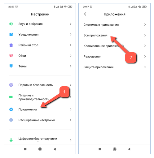 Для выдачи соответствующего разрешения необходимо запустить настройки мобильного устройства. В настройках нужно перейти по цепочке «Приложения» => «Все приложения» .