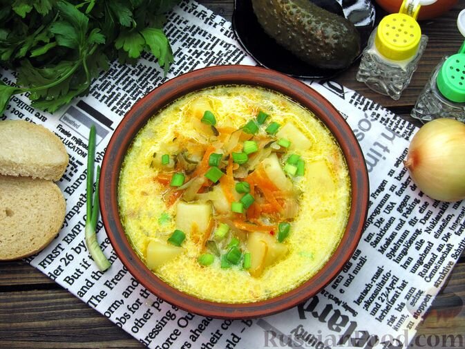 Очень вкусный рассольник по-польски готовится на курином бульоне с добавлением сметанной заправки. Хотя суп готовится без крупы, он получается достаточно густым и насыщенным, с нежным сливочным вкусом и приятной кислинкой. Ещё одна интересная особенность - натёртые маринованные огурцы и обжаренные овощи добавляются в самом конце приготовления, поэтому огурчики не теряют свой вкус и остаются слегка хрустящими. Это очень вкусно!