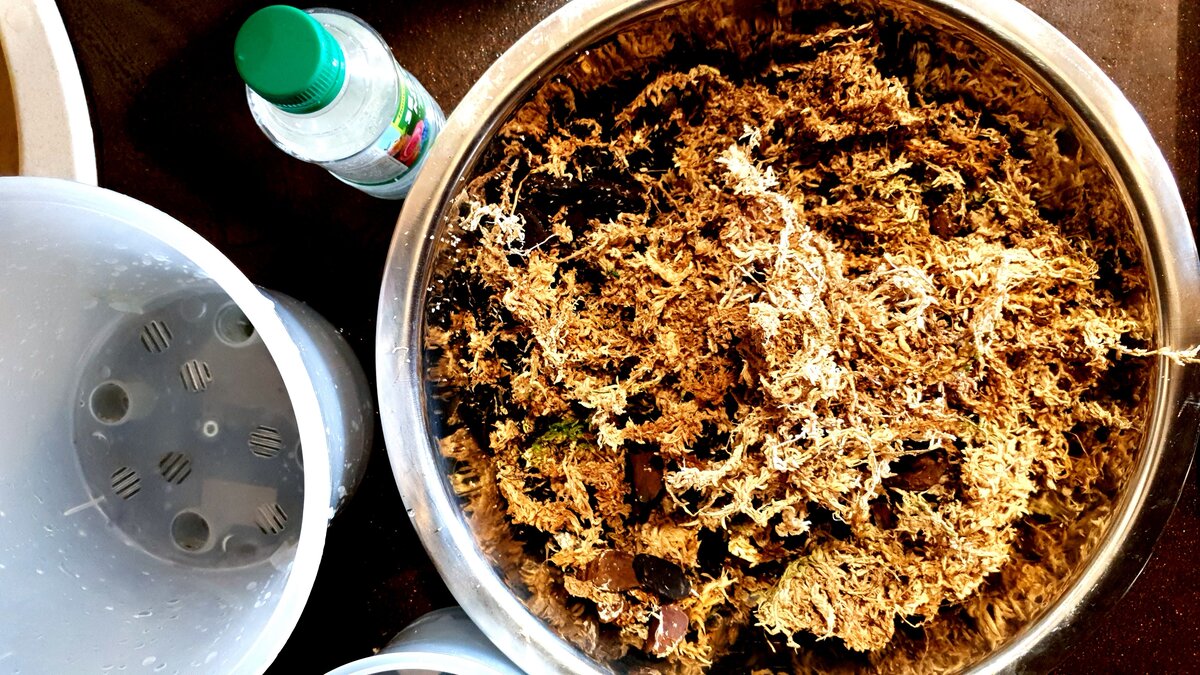 Я отсортировала кору и мох, выбрав самые крупные элементы из общей массы. Использовала кашпо от орхидей со сливом, чуть позже скажу, почему.