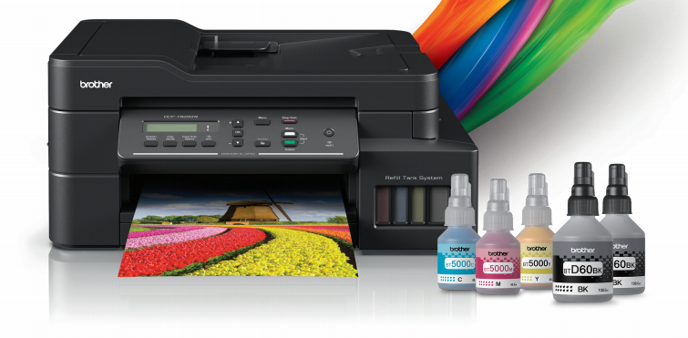 - DCP-T820DW, DCP-T720DW: цветная печать, сканирование, копирование. Беспроводное подключение. Автоматический дуплекс. Возможность подключения по сети Ethernet. Обе модели комплектованы набором чернил по 3 каждого цвета (синий, пурпурный, жёлтый, каждый на 5 000 отпечатков) + 2 чёрные (каждый по 7 500 отпечатков).