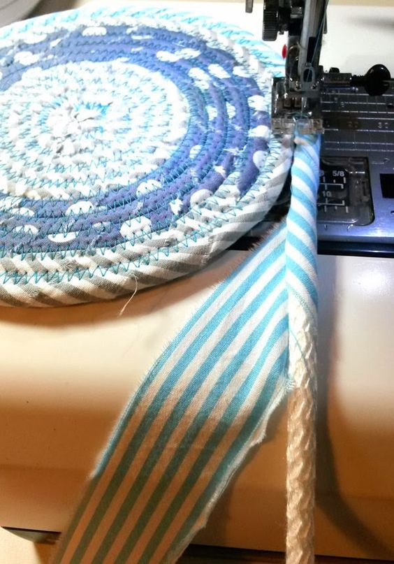 Такой коврик делается достаточно легко: сплетаются косы из трех полос ткани (по ширине не меньше 15 мм, можно больше - в зависимости от нужной вам толщины). Затем плетется длинная коса, в которой вы не увидите место сшивания: оно хорошо скрыто в толще косы. Коса укладывается в круг, между косами еще и шнур, тонкая косичка или веревка при желании. Сшивается на машинке или вручную.