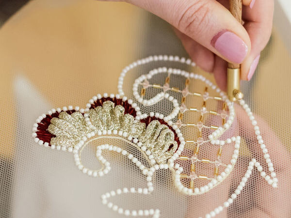 Всю необходимую фурнитуру — бусины, пайетки и прочее — пришивают к ткани с помощью тамбурного шва, составляющего основу люневильской вышивки. Визуально этот шов похож на цепочку, звеньями которой являются стежки.