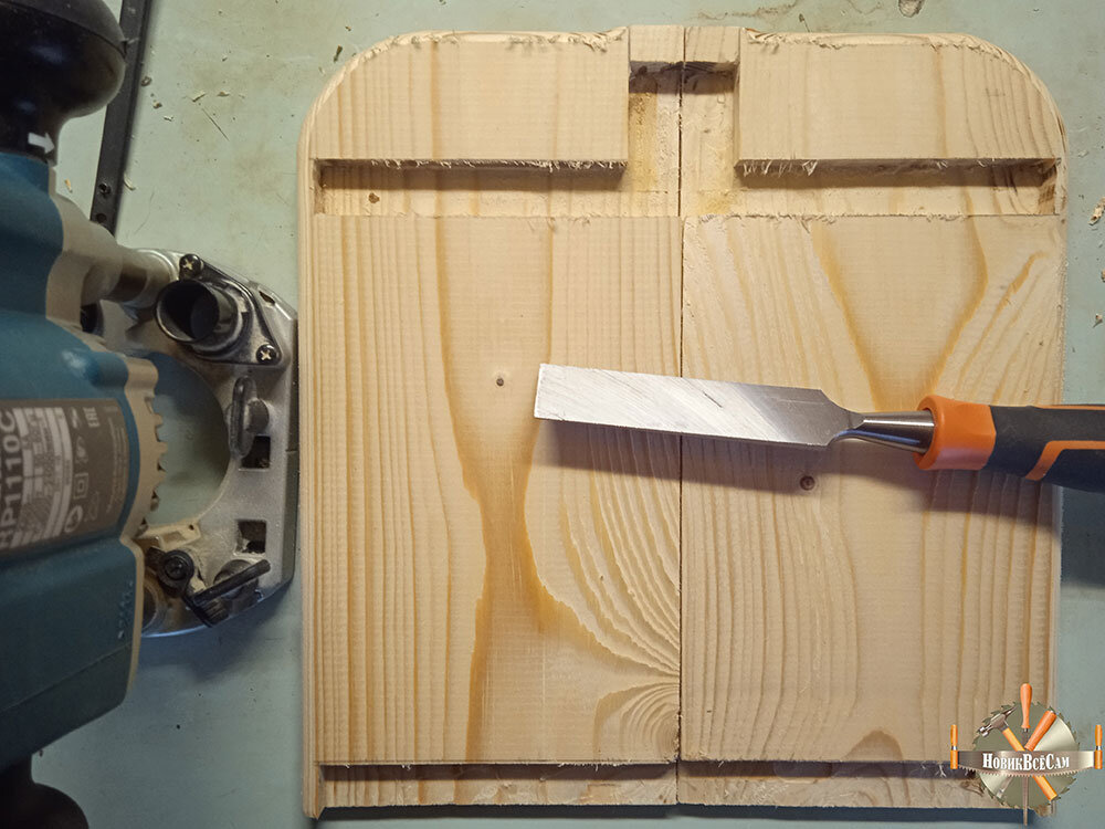 Начал с изготовления боковин. Из доски толщиной 2 см шириной 14,5 см отпилил две заготовки по 30 см. В верхней части, с передней стороны скруглил углы. Кромочной калевочной фрезой отфрезеровал заготовки с внешней и внутренней стороны, а пазовой прямой фрезой отфрезеровал места для крепления полок и задней стенки (верхней полки) на глубину 1 см.