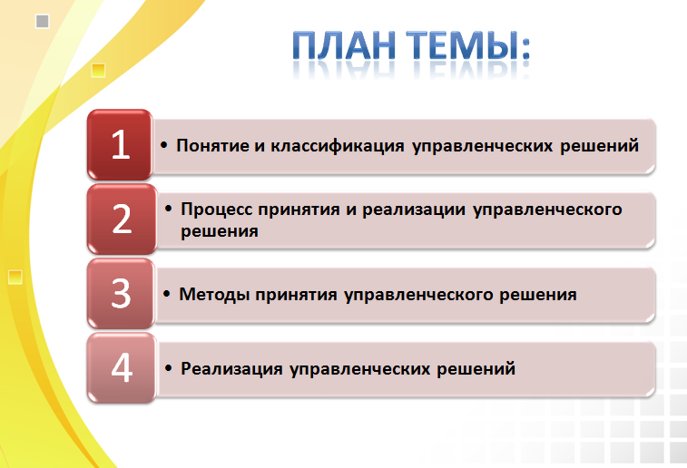 Принятие решений полностью зависит от квалификации руководителя, стиля руководства и культуры организации.