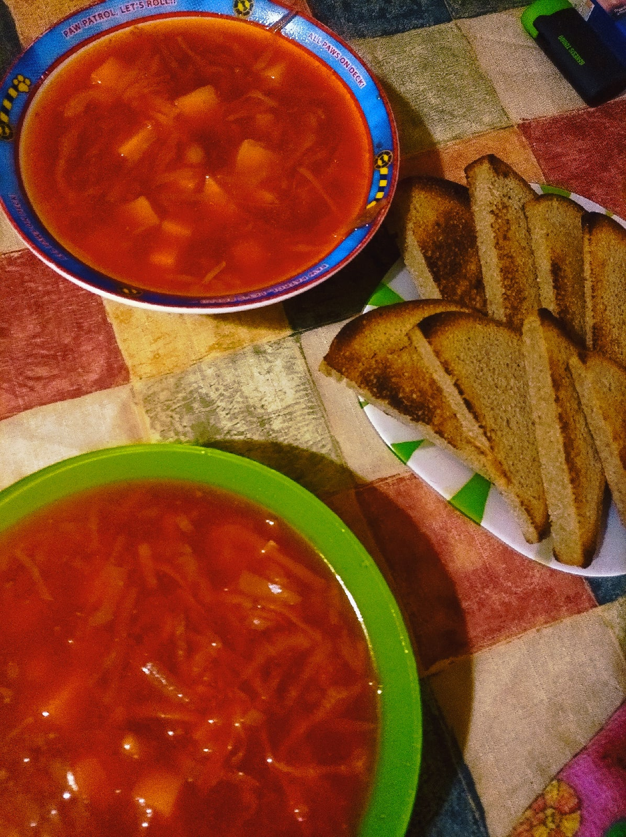 К борщу засушила трехдневный хлебушек. Каждый сам решил, чем мазать. Муж доедал шпик, сын натирал чесноком. Странный