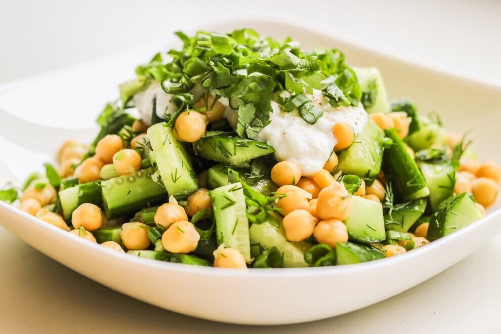 Салат из нута и огурцов готовится за 5 минут: