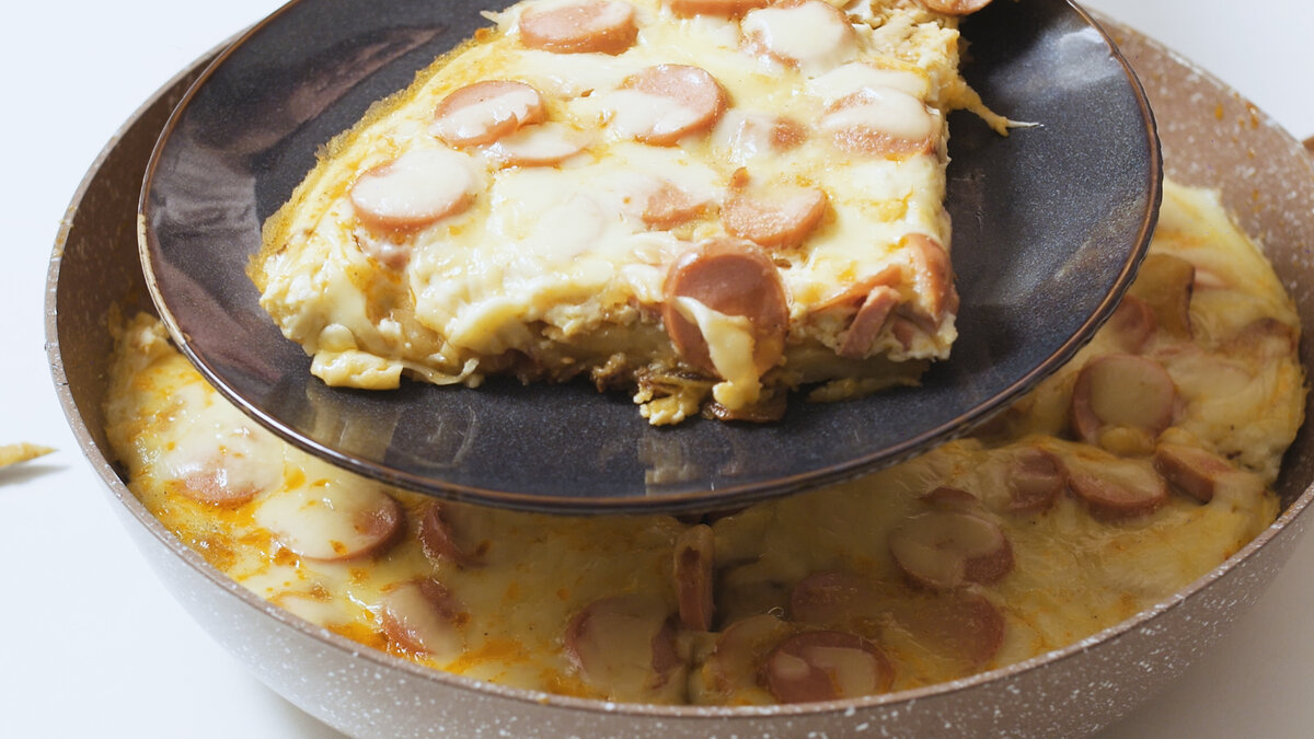 Закройте крышкой на 2 минуты, когда яйца схватятся выключите плиту. Дайте картофельной пицце постоять еще пару минут и можно подавать на стол.