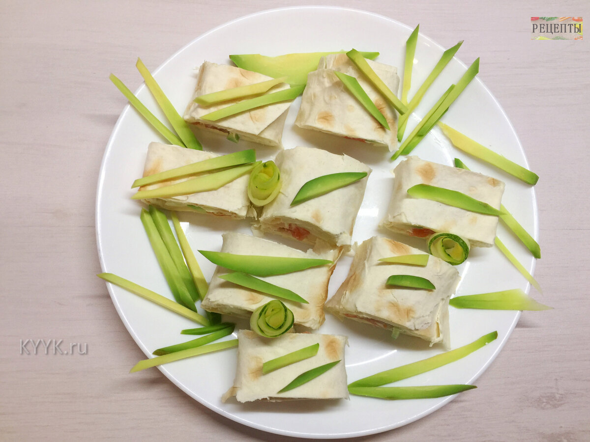 Кроме того, можно сделать еще один вариант без рыбы. Конечно, ни так интересно, но спелый авокадо, свежий огурец и сливочный сыр – прекрасно сочетаются с тонким лавашем.