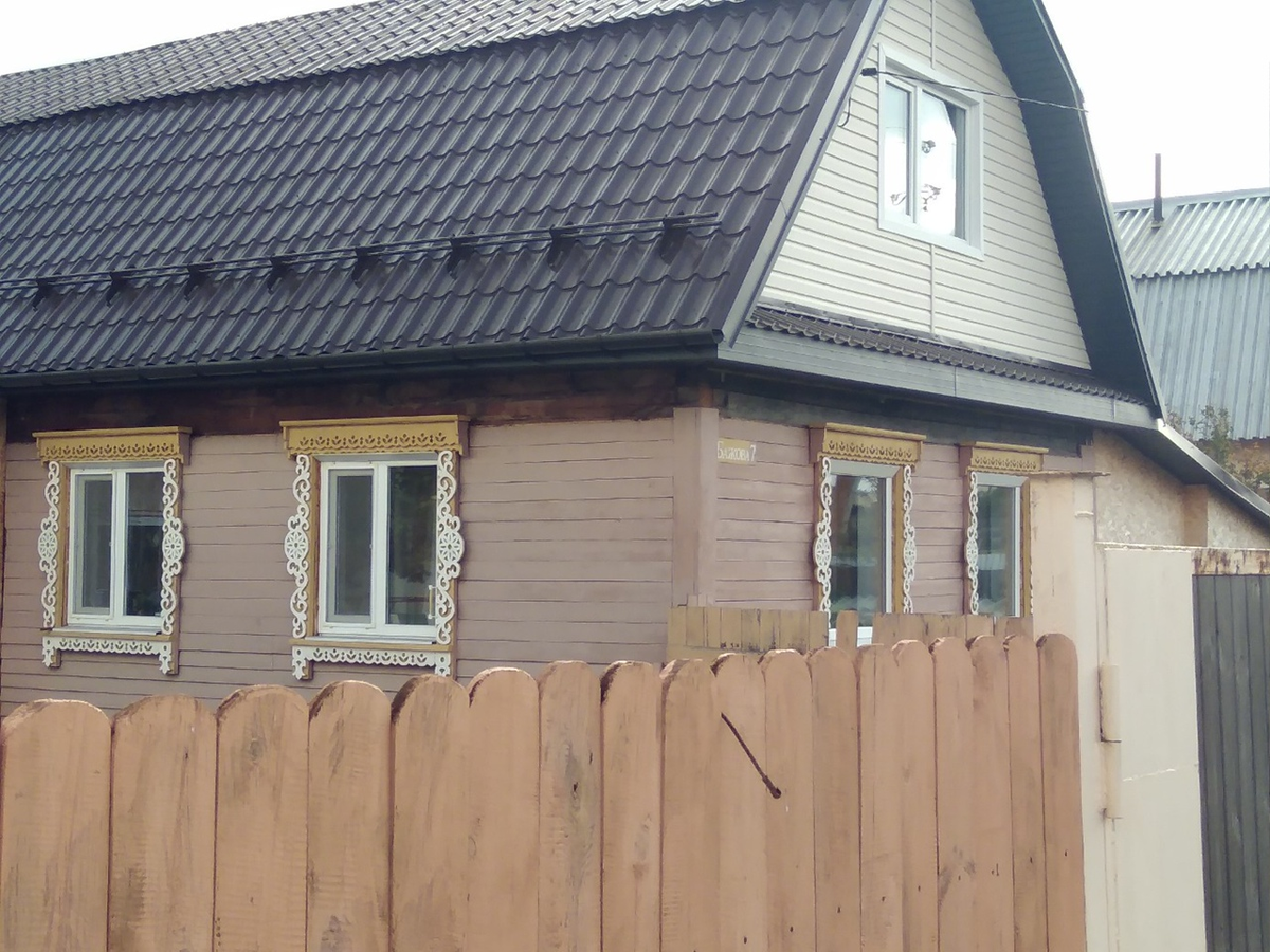 Резная обналичка на окнах и крашеная доска на фасаде.