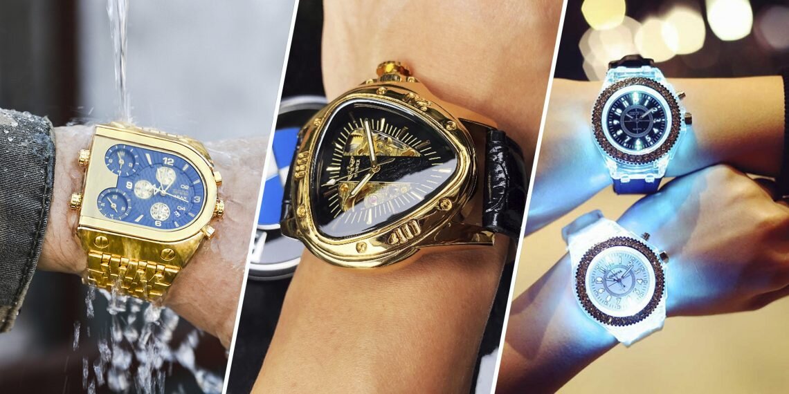 Последний участник парада необычных циферблатов. У этой модели стрелки движутся по четырём полукруглым линиям и показывают время на них. Также часы оснащены календарём и тремя декоративными секундомерами. Ремешок аксессуара выполнен из нержавеющей стали и оформлен под миланское плетение. На выбор продавец предлагает шесть разных расцветок корпуса и циферблата.