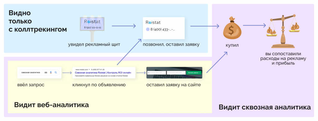 Пользователь перешёл с рекламы в Google на сайт и позвонил по указанному номеру телефона. Без коллтрекинга система аналитики покажет пустой визит без заявки — для неё клиент просто ушёл с сайта. А сработала ли офлайн-реклама, останется только гадать.