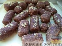Продукты (на 8 порций) Печенье песочное (сахарное) - 300 г Сгущенное молоко - 0,75 стакана Масло сливочное (мягкое) - 100 г Какао-порошок - 2 ст. ложки Грецкий орех (для украшения) - по