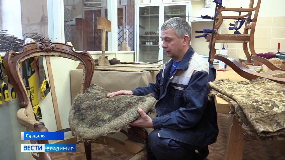 Валентин Мельник, реставратор по дереву Владимиро-Суздальского музея-заповедника: «У одного кресла уже идёт сборка основной конструкции, второе кресло - только начинается работа. Идёт заделка гвоздевых отверстий, заполнение утрат массива. В процессе работы над гарнитуром при демонтаже была обнаружена ткань-гобелен, более раннего происхождения. По всей видимости, она является родной тканью этого гарнитура».
