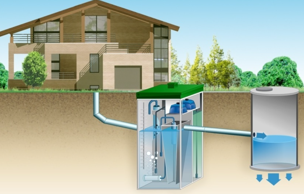 В 1-ой камере происходит грубая очистка как в септике. На дне оседают тяжелые частицы и продукты жизнедеятельности. Далее осветленные стоки попадают во вторую камеру, в которой происходит дополнительное изъятие частиц за счет химической реакции и соединения с кислородом. Дальше стоки попадают в третью камеру, которая выполняет роль отстойника и далее либо принудительно, либо самотеком стоки сбрасываются на грунт.