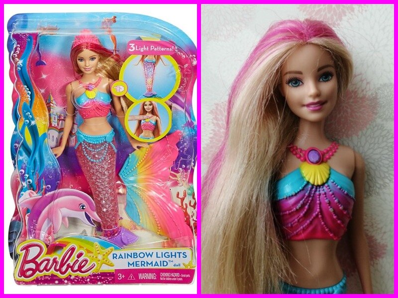 Барби Кукла Barbie Rainbow Lights Mermaid вышла в 2015 году. И мы сразу же её купили. Потому что это была кукла-мечта моей 3-летней дочки. Т.е. кукла в нашей семье живет уже 6 лет. За это время он многое повидала, прошла через снег, воду и ящик с игрушками. И до сих пор цела!
