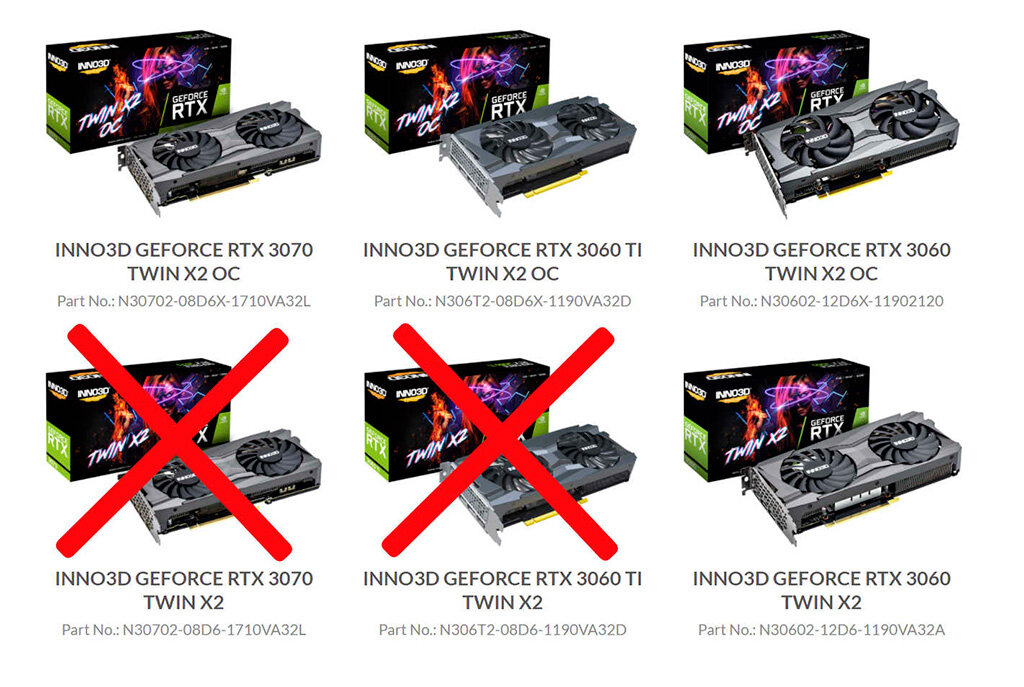 Нехватка графических процессоров для видеокарт GeForce RTX 3000 толкает производителей на необычные меры. Как стало известно, компания Inno3D временно приостанавливает производство адаптеров GeForce RTX 3070 и GeForce RTX 3060 Ti в модификации Twin X2, но не всех. Временно упраздняются версии без заводского разгона и без соответствующей приписки “OC”. Причина проста: графических процессоров мало,