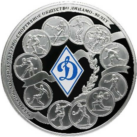 на зеркальном поле диска в центре - эмблема общества "Динамо", исполненная в синем цвете, лента и лавровая ветвь в окружении одиннадцати круглых медальонов с изображениями спортсменов, слева и вверху на светлой полосе вдоль канта - надпись: "ВСЕРОССИЙСКОЕ ФИЗКУЛЬТУРНО-СПОРТИВНОЕ ОБЩЕСТВО ДИНАМО-90 ЛЕТ".